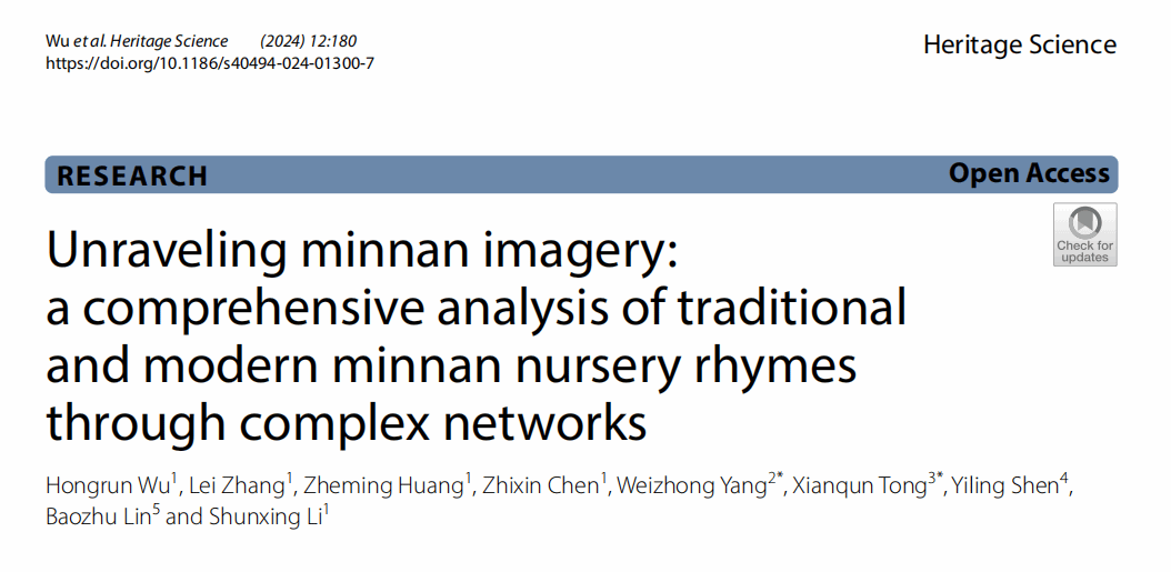 近日,我校多个学科领域的教师紧密合作,开展跨学科交叉融合研究,以yl23455永利集团吴泓润老师为第一作者在国际文化遗产领域的权威学术期刊《Heritage Science》上发表论文“Unraveling Minnan Imagery: A Comprehensive Analysis of Traditional and Modern Minnan Nursery Rhymes Through Complex Networks”。