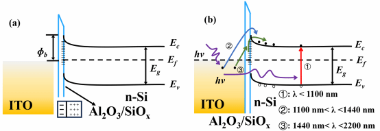 光电探测器作为现代光电子信息系统的核心传感单元,其性能直接决定高速数据通信、环境侦察、夜视成像及生物医学诊断等前沿应用的技术突破。Si 材料虽具备 CMOS 工艺兼容、载流子迁移率高等优势,但其固有带隙(1.12 eV)将光谱响应限制在1100 nm以下,无法覆盖关键通信波段(1300-1600 nm)。当前研究面临核心挑战:如何在不牺牲暗电流性能的前提下扩展 Si 基探测器的长波红外响应能力。针对这一难题,研究团队创新性地设计了 ITO/Al2O3/SiOx/n-Si 肖特基光电探测器结构,通过 Al2O3/SiOx 双层界面工程协同调控载流子传输。器件制备采用原子层沉积(ALD)和磁控溅射技术:首先对 n-Si 衬底进行 RCA 清洗和 HF 处理去除原生氧化物,随后沉积2 nm厚 Al2O3 层,最后生长ITO顶电极和Al背电极。该结构通过优化界面特性,实现了暗电流抑制与宽带响应的完美平衡。