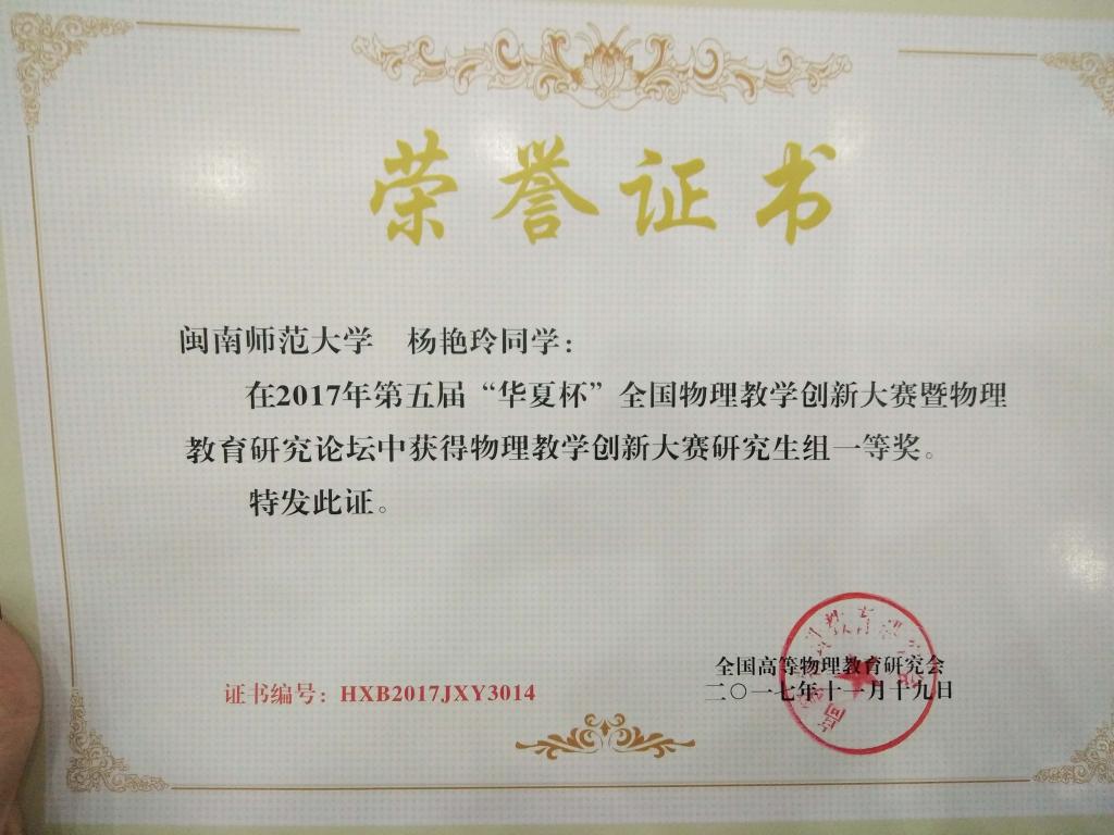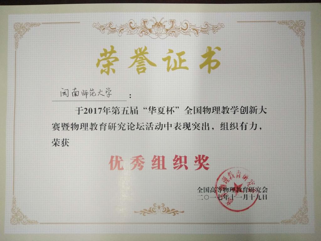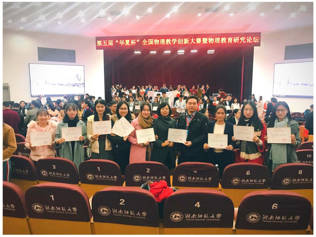 2017年11月19日,由全国高等物理教育研究会主办、湖南师范大学物理与信息科学学院承办的第五届“华夏杯”全国物理教学创新大赛暨物理教育研究论坛在湖南师范大学落幕。本次参赛高校共计47所,包括华东师范大学、华南师范大学、东北师范大学、华中师范大学等多所985、211大学,参赛人数多达300名。我校物信学子在此次比赛中载誉归来。