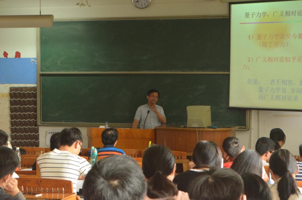 朱教授从牛顿的三大定律开讲,通过对比说明了量子力学和经典力学的不同,让我们对微观力学有了初步的认知。朱教授说,量子力学是非局域的理论,而广义相对论是局域的理论,量子力学是至今最正确的理论,并且他还将这一抽象的概念通过比喻,让同学们在有形中明白局域和非局域的区别。朱教授向大家解释了量子力学的形式,并引用了量子卫星的例子,将量子力学成功过度到计算物理学。朱教授从任务,作用,方法,研究事例等方面向大家充分揭示了什么是计算物理学,强调了计算物理学中的“prediction”能力,在过去,金刚石是最硬的材料,1985年marvin通过计算预言超硬材料,随着时间的证明,实验室中终是合成了超硬材料。朱教授还举了核武器禁试条约的达成,说明了计算物理学的现实意义。最后在提问环节中,同学们积极发言,向老师提出了许多问题,朱教授皆一一认真为大家解惑。
