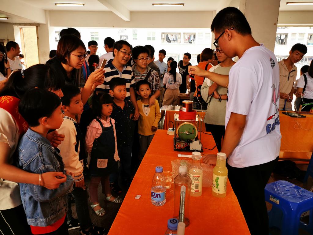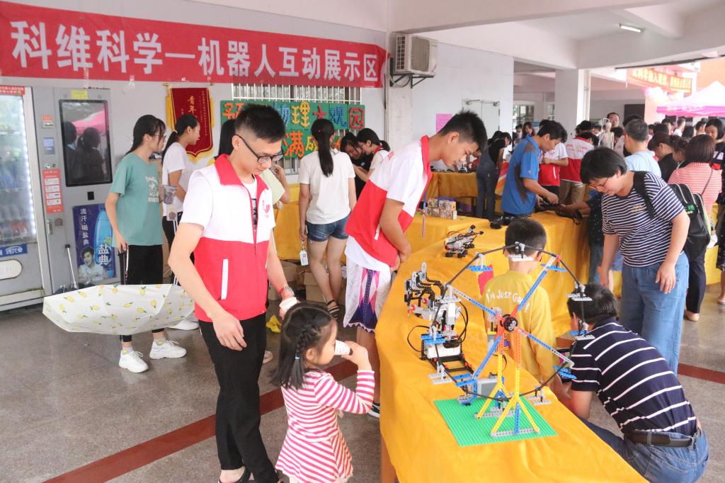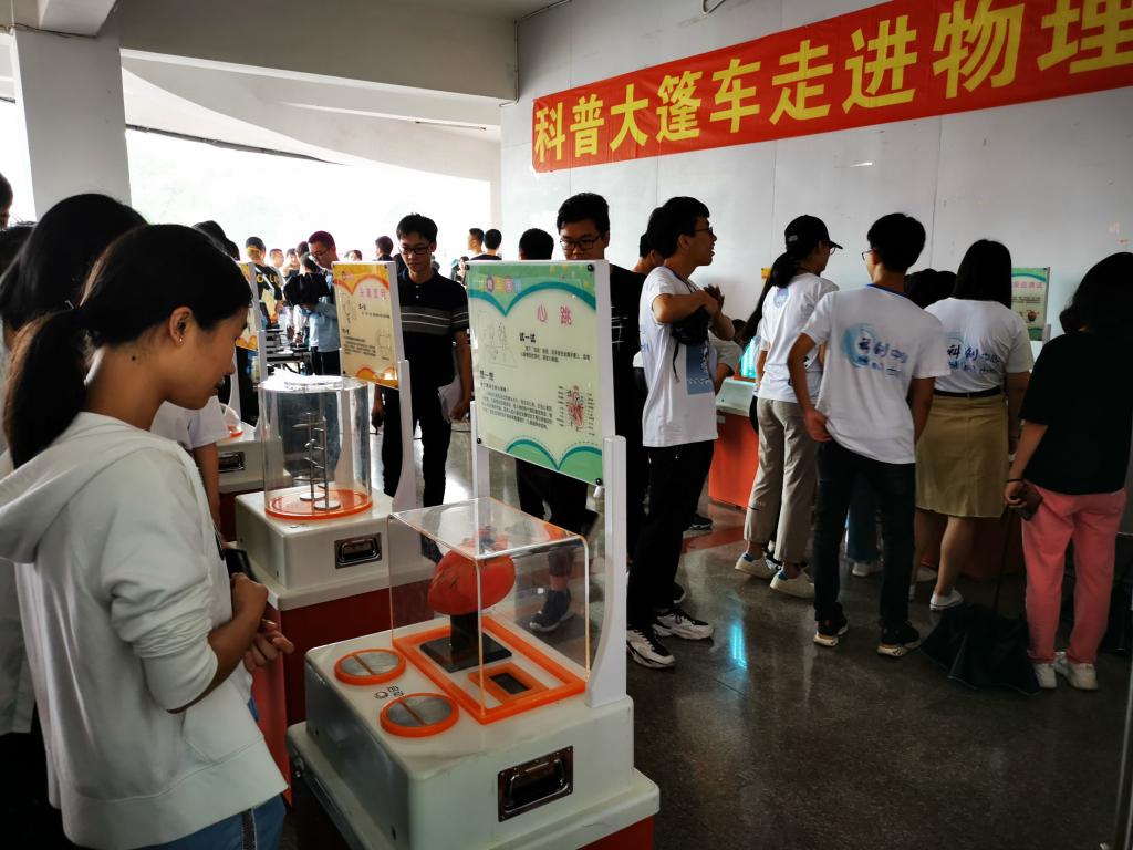 此次物理大观园设有八个模块:一是电子设计作品展区,包括校电子设计大赛、省合泰杯竞赛一等奖作品等;二是物理教具展区,出自未来人民教师们的作品新颖有趣,各种各样的新型教具引得大家观看讨论;三是智能小车和无人机展区,地上小车智能循迹穿梭,空中无人机翩然来回;四是画伞展区,色彩斑斓、风格多样的画伞,是物信人温柔的一面;五是板块展区,文图结合,精心设计的展板详细介绍了大观园活动内容、还有禁毒知识、反邪教海报,时时向大家科普宣传;六是科普大篷车展区,简单有趣的游戏机是游园必体验项目;七是科维游戏互动区,利用乐高EV3拼装机器人,开启游戏大闯关;八是义务维修区,彰显了我院学子学以致用、为人民服务的良好精神风貌。
