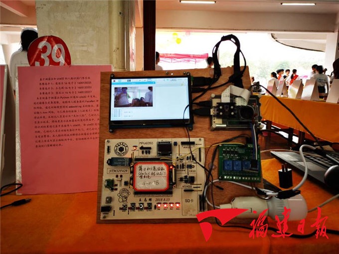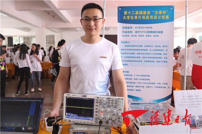 电子设计作品展区共展出设计作品47件,均是学生参加各类电子设计大赛的获奖作品。其中第十二届福建省“合泰杯”单片机应用设计竞赛一等奖作品“基于HT32的网络示波器”吸引了众多师生,该作品克服了传统数字示波器体积大、成本高和无法远程观测故障信号等缺陷,同时增加了万用表等功能,拓展了示波器的使用面。2019年校电子设计大赛决赛作品也让大家眼前一亮。基于树莓派Python环境和STM32开发板的人脸识别系统门禁,通过摄像头采集图像和网络算法,实现门禁人脸识别;“超市智能寄存管理系统”采用指纹识别技术完成开箱动作,提高便捷性与安全性,减少传统纸质小票的使用,更加环保。基于STM32的石头剪子布机械手,让现场观众玩得兴致勃勃……