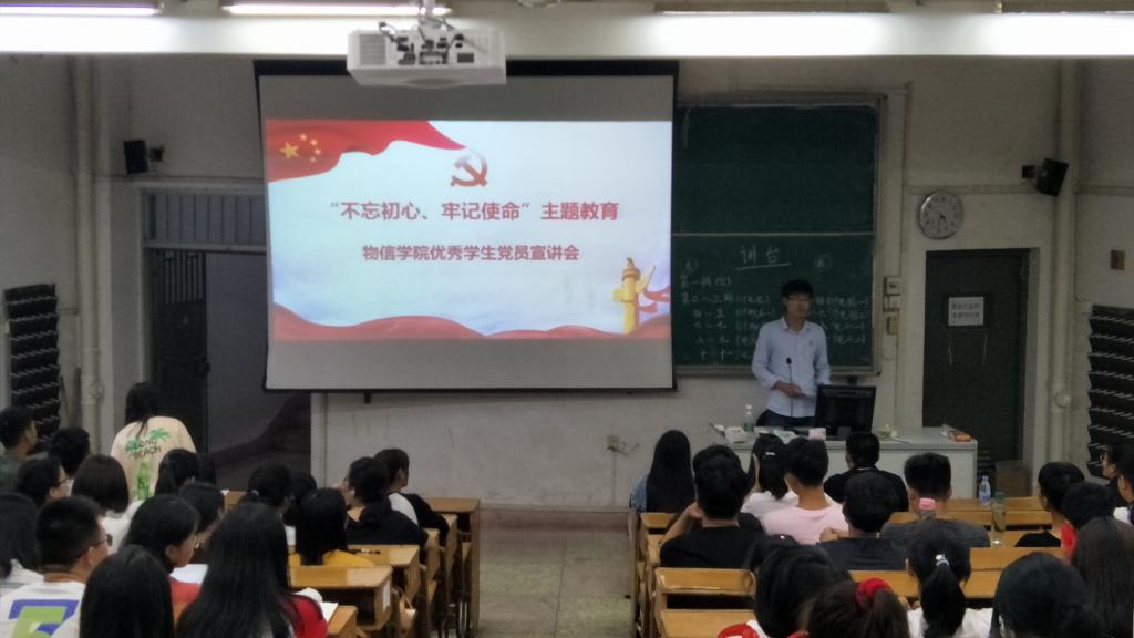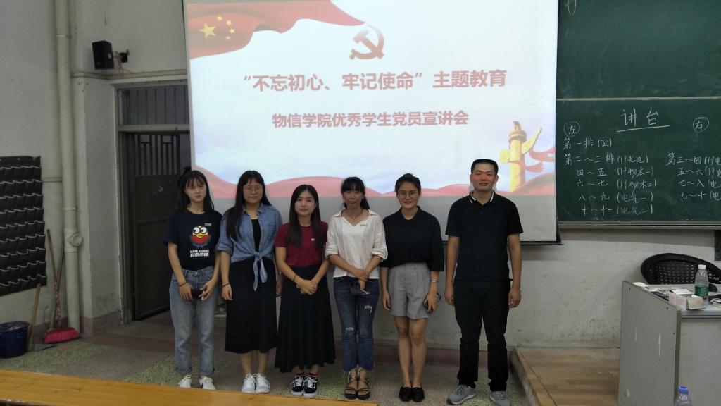 为贯彻落实习近平总书记在“不忘初心,牢记使命”主题教育工作会议上重要讲话精神,宣传秉持理想信念、保持崇高境界、坚守初心使命、敢于担当作为的先进典型,形成学习先进、争当先进的良好风尚。2019年10月12日,物信学院在达南106教室举行“不忘初心,牢记使命”主题教育优秀党员宣讲会。