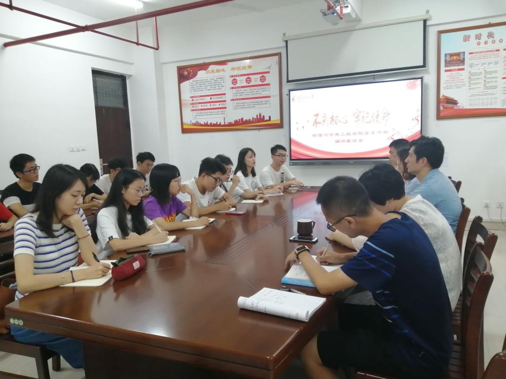 为加强物信学院学生干部队伍建设,促进学院各学生组织干部之间的工作交流,了解学生干部对学院教育教学、管理服务、学生综合素质培养等方面的意见和建议,充分调动学生干部参与管理的积极性和主动性,2019年10月14日晚,我院在科北907召开了“不忘初心,牢记使命”主题教育学生干部调研座谈会。我院党委主持工作副书记杨红和、院党委副书记胡莉丹、院团委副书记杨超男、全体新生辅导员老师以及学生组织A类干部参加了交流座谈。
