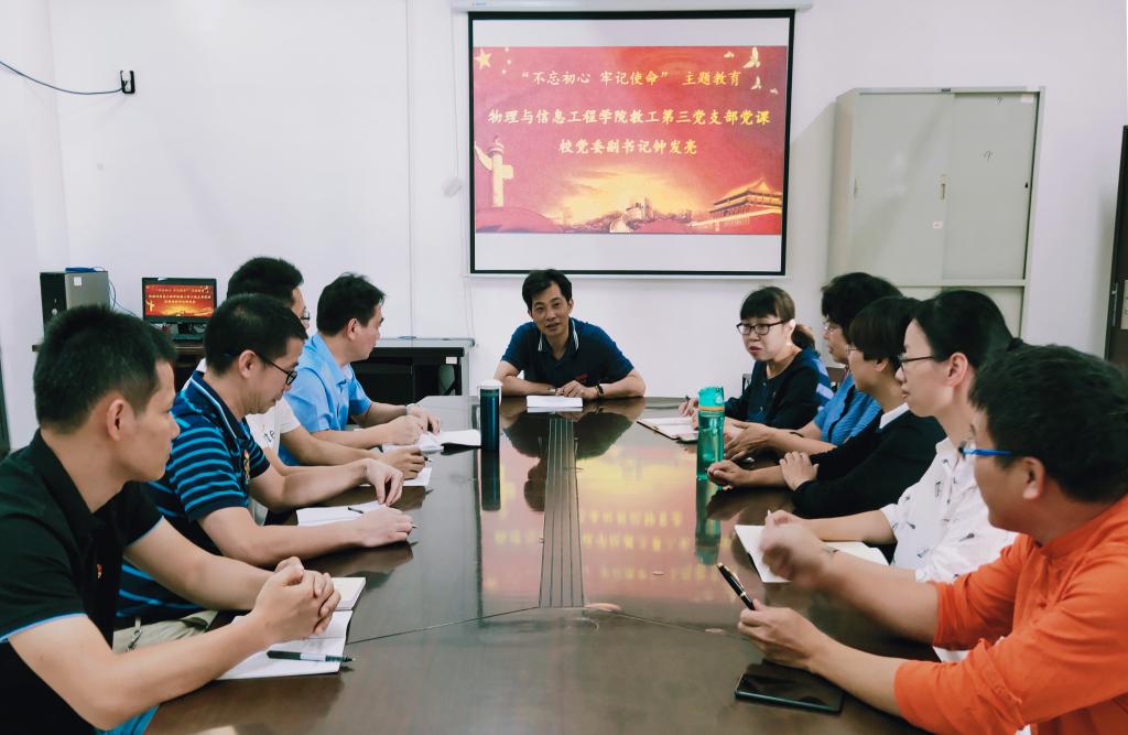 10月17日,学校党委副书记钟发亮到其联系指导的yl23455永利集团教工第三党支部给支部党员上了一堂生动的“不忘初心、牢记使命”主题教育专题党课。