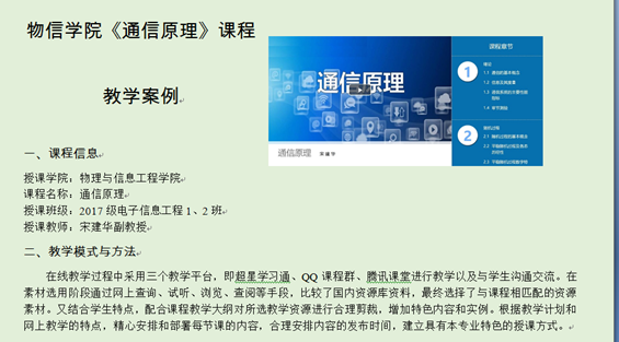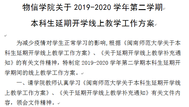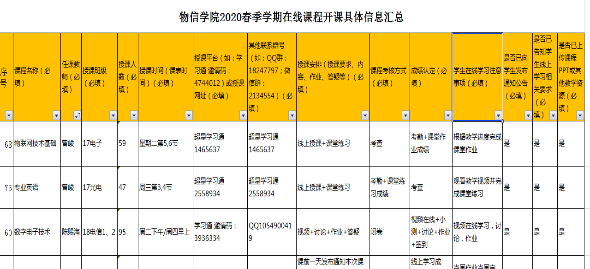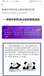 面对疫情导致的延期开学,学院及时制定《物信学院关于2019-2020学年第二学期本科生延期开学线上教学工作方案》,启动延迟开学期间线上教学各项准备工作,布置教学任务和安排,及时收集《物信学院2019-2020第二学期在线课程开课具体信息汇总表》《物信学院2019-2020第二学期申请延期开课情况汇总表》等表格,掌握线上教学开课情况、了解开课平台等信息。学院通过超星学习通、爱课程、智慧树、腾讯课堂等在线课程平台,结合录屏、直播等手段进行线上学习。及时组织师生进行前期平台操作使用培训,并鼓励教师进行线上教学模式交流分享。同时,组织教师建立了覆盖全体听课学生的课程微信群、QQ群,为学生提供在线学习支持。对于少数教师因疫情管控、网络条件等原因无法开设线上课程,教务科及时向教务处备案延期开课,并稳妥做好后续工作。对于实践课程的延期开课,制定了《物信学院关于2020年春季学期本科生延期开学实践教学环节管理工作方案》,以确保学生返校后实践课程能快速及时开展。