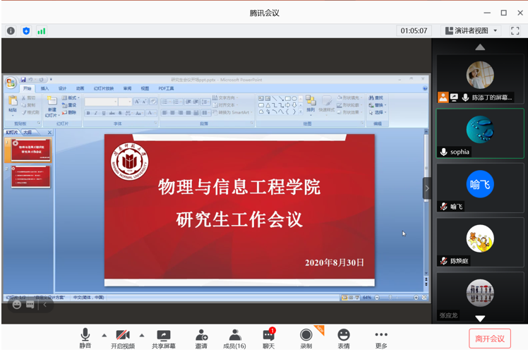 8月30日晚上,我院研究生工作会议通过腾讯会议平台顺利召开。会议由院分管研究生工作陈添丁副院长主持,与会人员包括我院学科教学(物理)和电子信息专业所有研究生导师、教师代表、研究生秘书等。