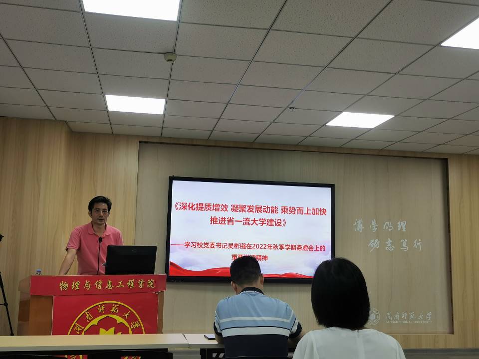 杨红和首先传达了学校2022年秋季学期务虚会及相关文件精神,组织大家认真学习校党委书记吴彬镪、校长李顺兴分别在2022年学校秋季学期工作务虚会上所做的《深化提质增效 凝聚发展动能 乘势而上加快推进省一流大学建设》《汇聚共识 深化融合 真抓实干 开辟新时代复合型内涵发展新路径》重要讲话精神。