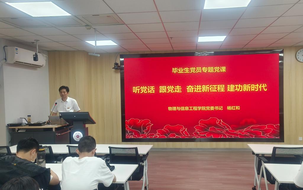 为深入开展学习贯彻习近平新时代中国特色社会主义思想主题教育,加强毕业生党员离校教育,进一步强化毕业生党员爱校荣校和责任意识,激发毕业生党员使命担当,2023年6月19日,我院党委书记杨红和在科技楼南809为2023届全体毕业生党员讲授“听党话、跟党走、奋进新征程,建功新时代”专题党课。