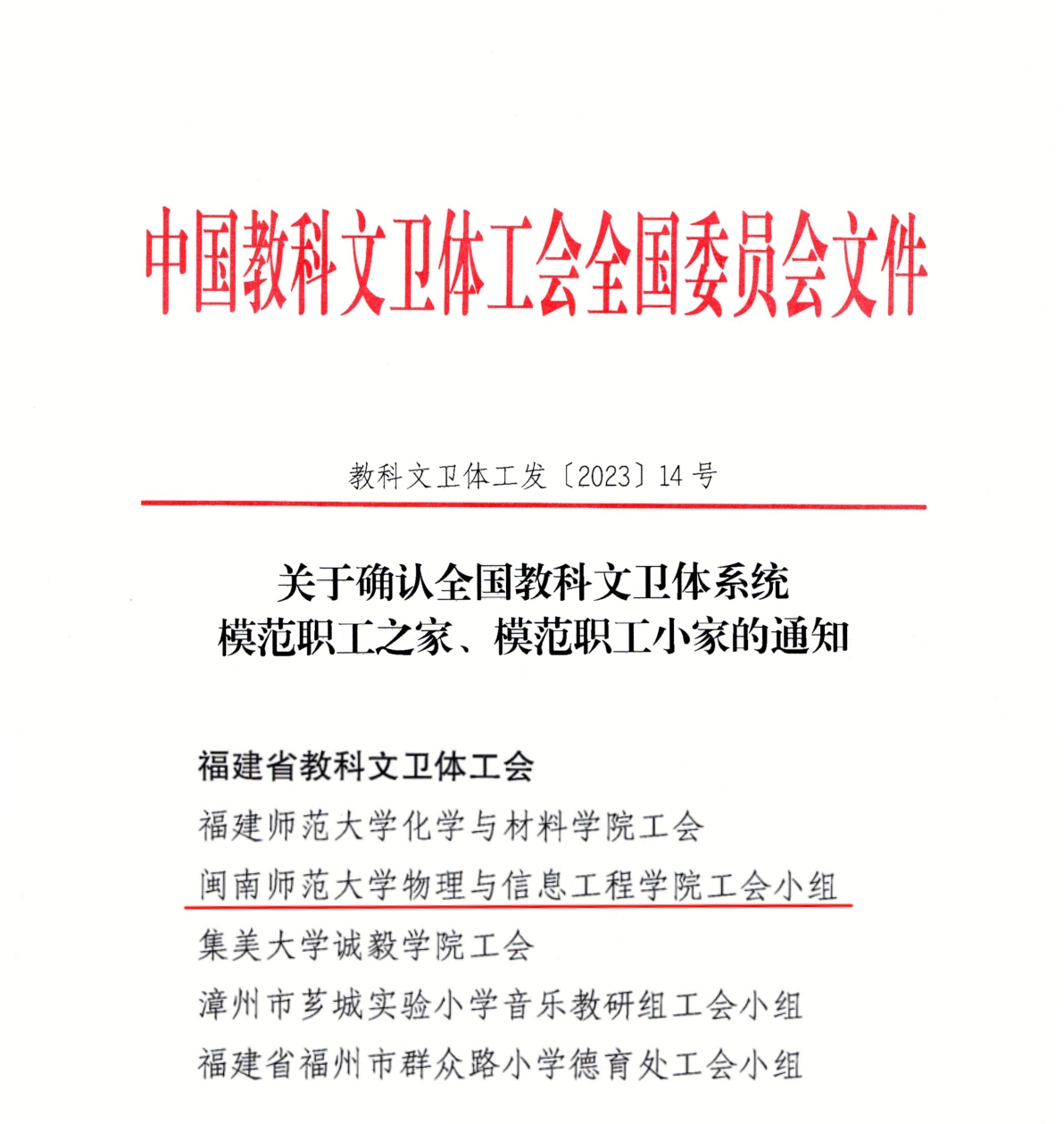 近日,中国教科文卫体工会全国委员会下发《关于确认全国教科文卫体系统模范职工之家、模范职工小家的通知》(教科文卫体工发〔2023〕14号),yl23455永利集团工会被选树为全国教科文卫体系统“模范职工小家”。这是学院工会在校工会关心支持下,继获得福建省教科文卫体系统“模范职工小家”荣誉称号之后获得的最高荣誉。