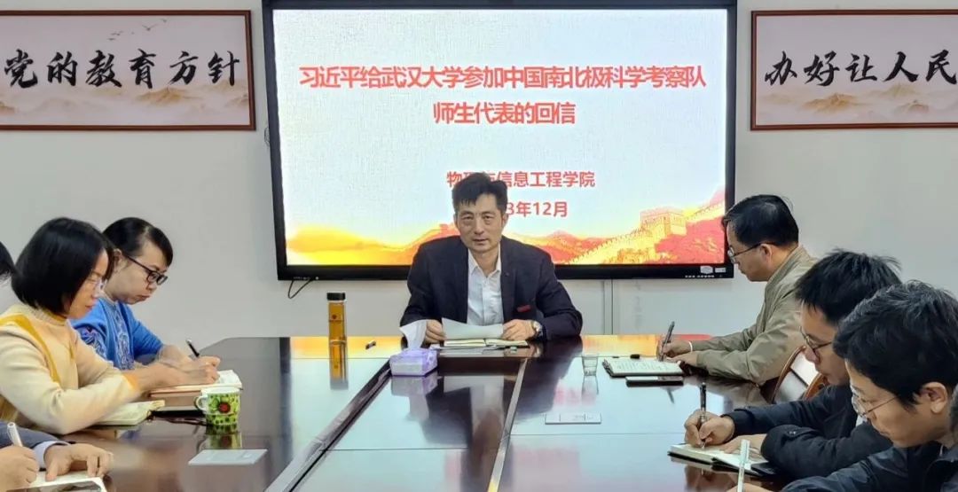 2023年12月18日,我院党委在科技楼北907召开党委理论学习中心组(扩大)学习会,学习传达习近平总书记给武汉大学参加中国南北极科学考察队师生代表的回信精神。学院党政领导、党委委员、科级干部、各支部书记、各系主任、全体辅导员老师等参加会议。