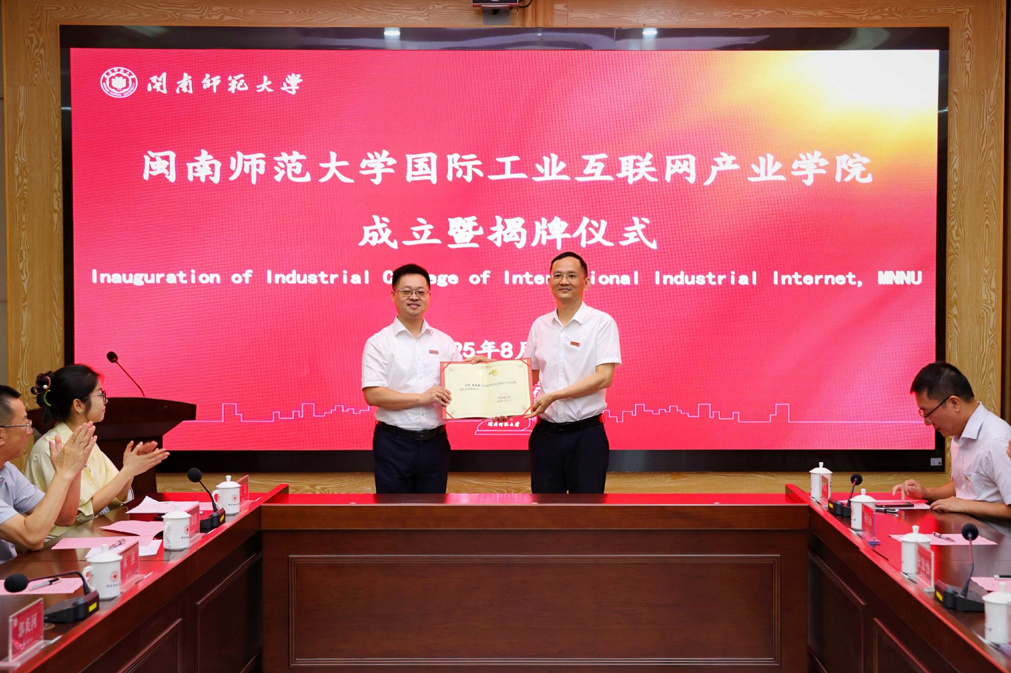 ▲校党委书记李顺兴为国际工业互联网产业学院院长陈志翔颁发聘书