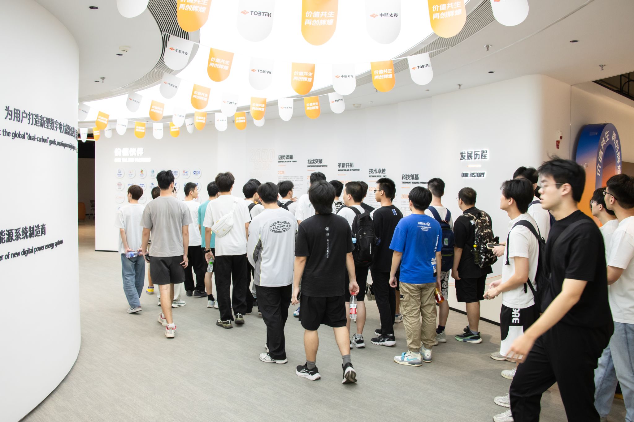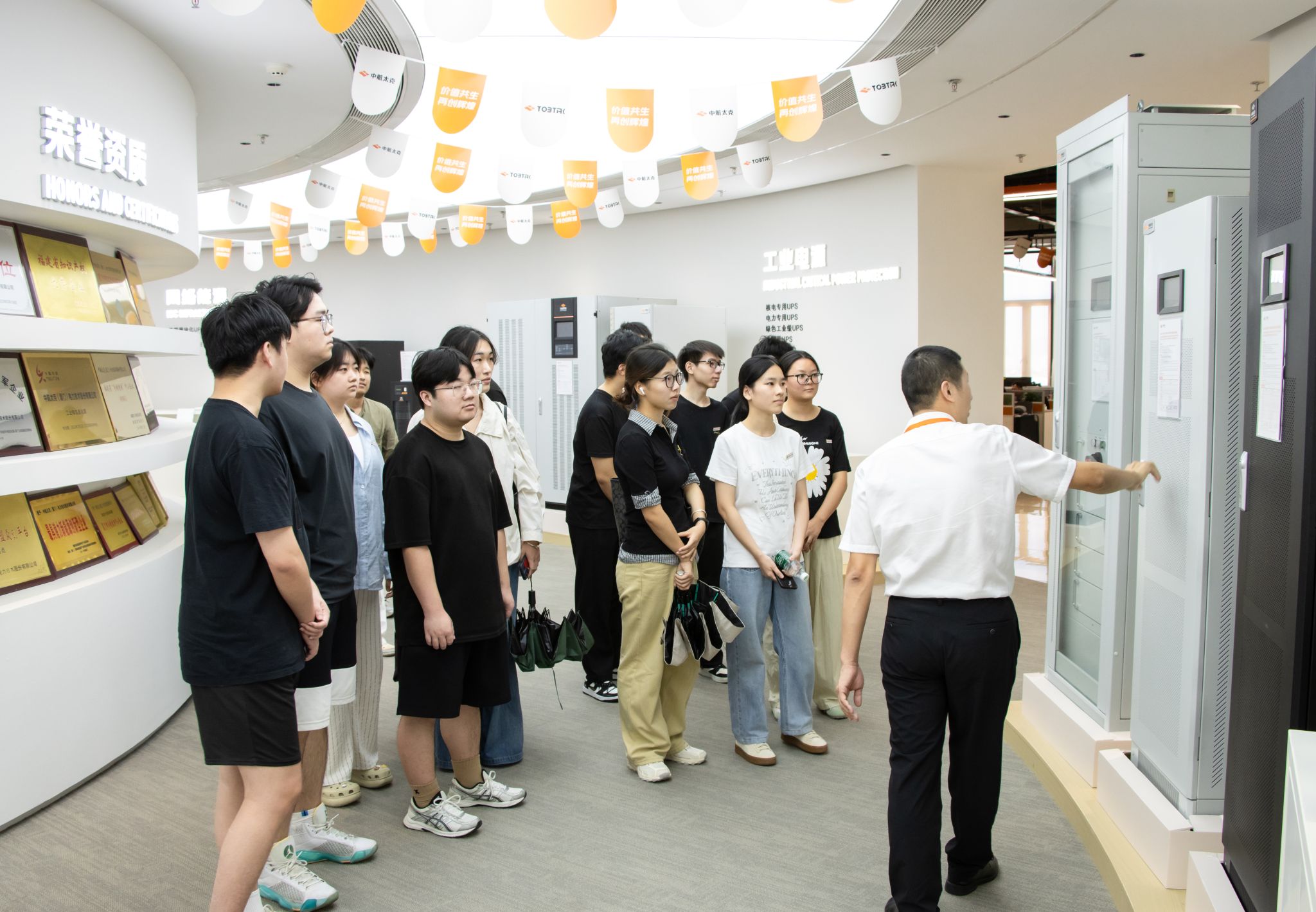 下午2时,师生一行抵达中航太克园区,受到企业代表热情接待。在简短欢迎仪式后,公司工作人员引导师生依次参观八楼办公区域与九楼产品展厅。从研发环境到成果展示,从企业文化到技术应用,参访过程全面展现了中航太克在电力电子技术领域的专业实力与创新氛围,为学生提供了一场沉浸式的行业认知体验。