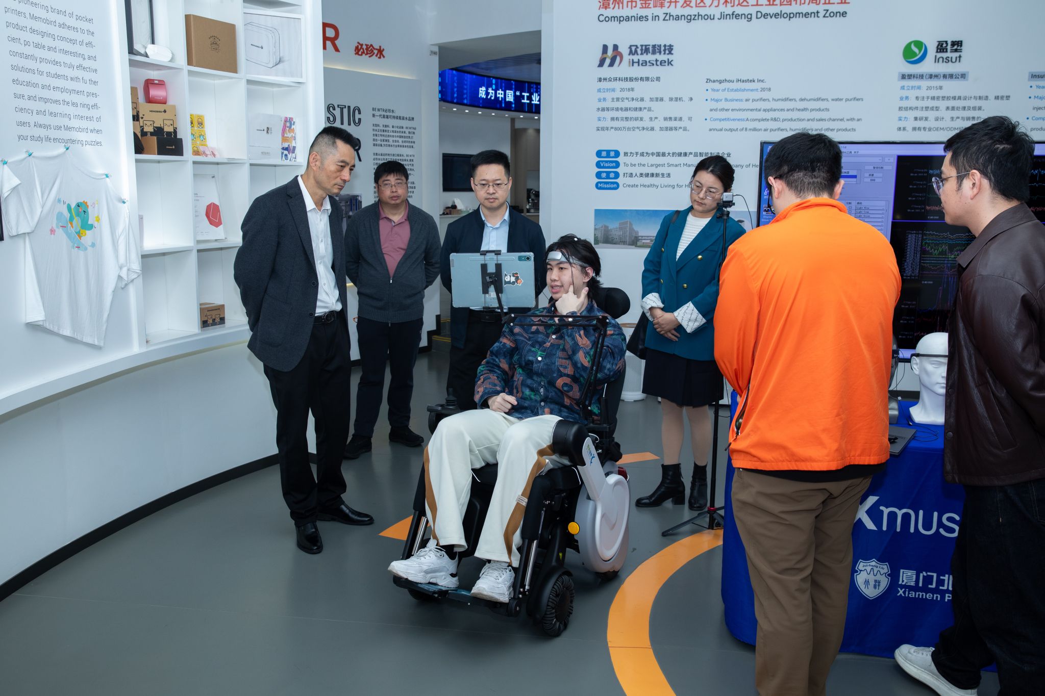 学院一行来到厦门盈趣科技股份有限公司,在公司总裁助理兼技术战略总工陈建成等陪同下参观了公司展厅,详细了解了企业发展历程、核心技术研发及产品布局。特别是其脑机接口相关技术及产品展示令人印象深刻,双方围绕该技术的研发进展、应用场景及人才需求进行探讨交流,为后续深化合作、精准对接人才需求奠定了基础。