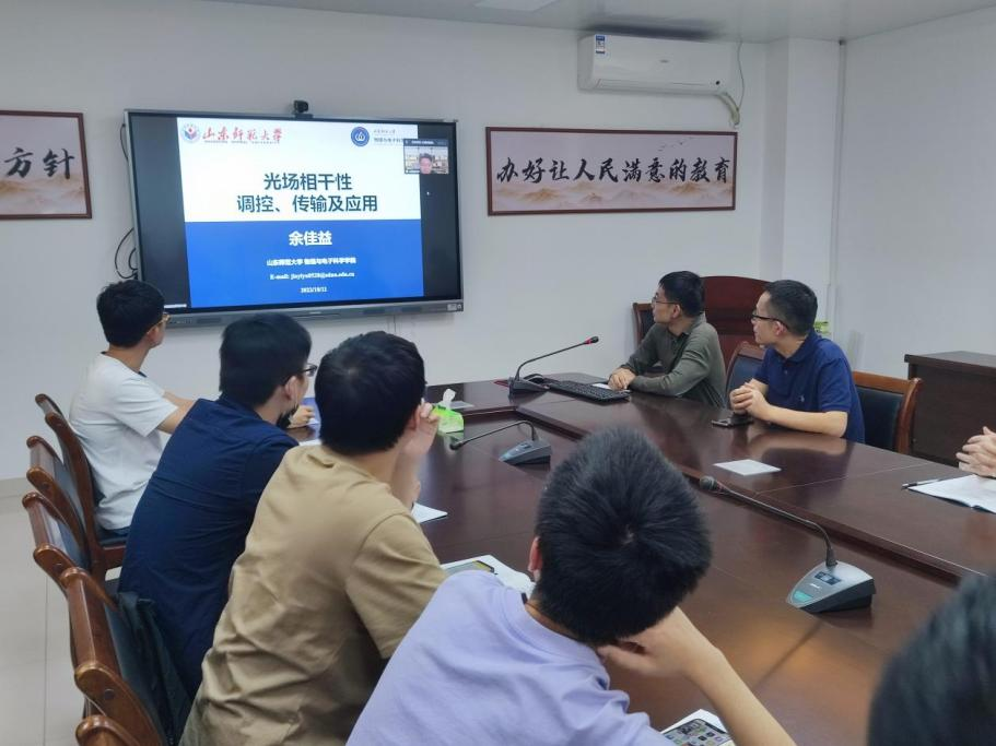 应我院邀请,10月11日晚上,山东师范大学物理与电子科学学院余佳益副教授为我院师生开展主题为“光场相干性调控及应用”的学术讲座。讲座于科北907进行,通过线上线下的方式进行交流,报告由院长助理徐星教授和物理系系主任张永涛教授共同主持。