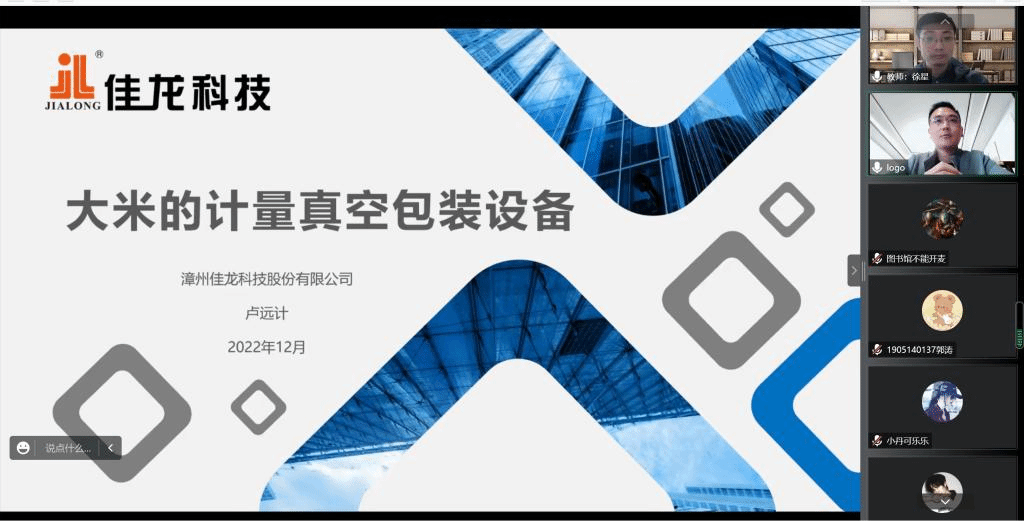 应我院邀请,12月3日上午,漳州佳龙科技股份有限公司工程师卢远计通过腾讯会议作了题为“大米的计量真空包装设备”的报告。相关师生聆听了此次报告,报告由院长助理徐星教授主持。