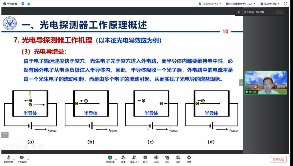 陈占国教授首先对光电探测器工作原理进行了详细的讲解,随后又对日盲光电探测器的研究进展进行了详细的归纳总结,并且提出了一些针对当前日盲光电探测器所遇到的问题和解决办法。陈占国教授深入浅出的讲解方式让在场师生受益匪浅。