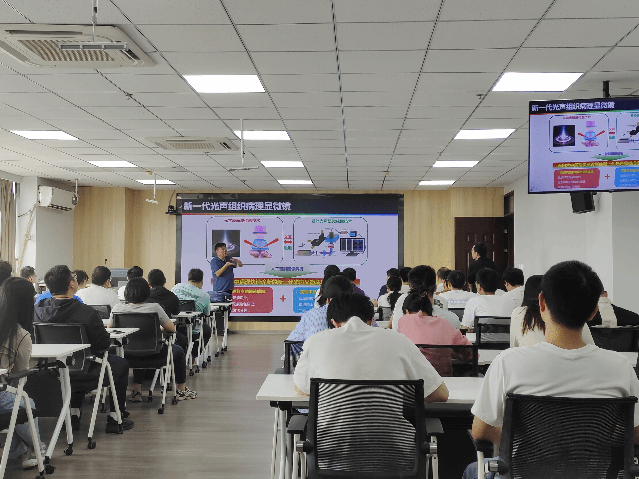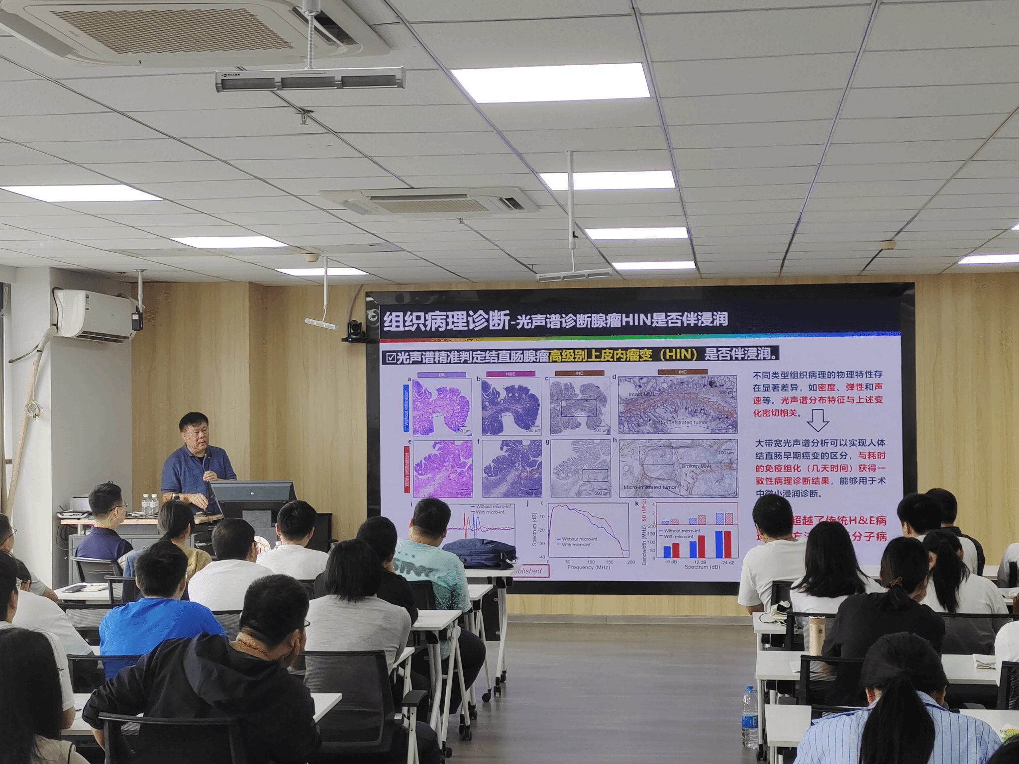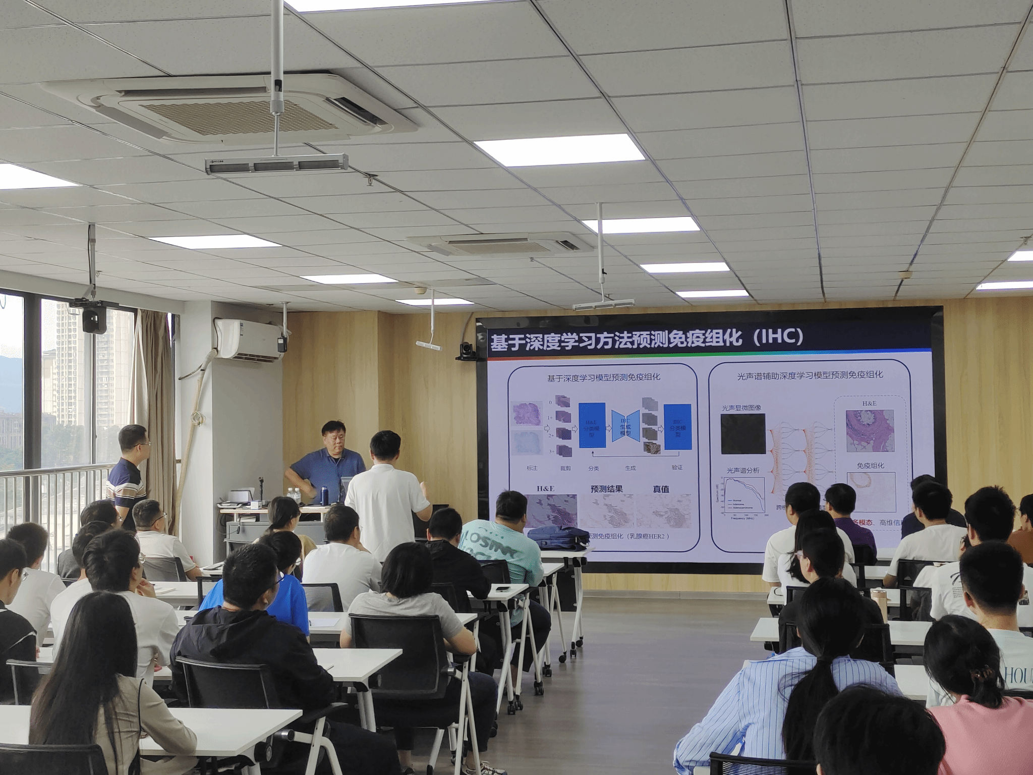 袁小聪教授通过光学表面波传感技术和紫外光声显微成像技术的交互融通以及人工智能图像解析,实现组织病理样本的快速成像和病理诊断信息的精确获取,该技术有望解决当前组织病理临床分析中存在的效率低、准确性差、时效性弱、结果单一等问题,同时也为基础研究提供一种“无损、精准、原位”的组织病理成像创新手段。此外,袁小聪教授为我们详细讲解基于深度学习方法预测免疫组化(IHC)。最后,袁小聪教授总结新一代光声病理诊断显微镜的五大技术突破以及传感检测极限的总体思路并回答了师生的疑问。