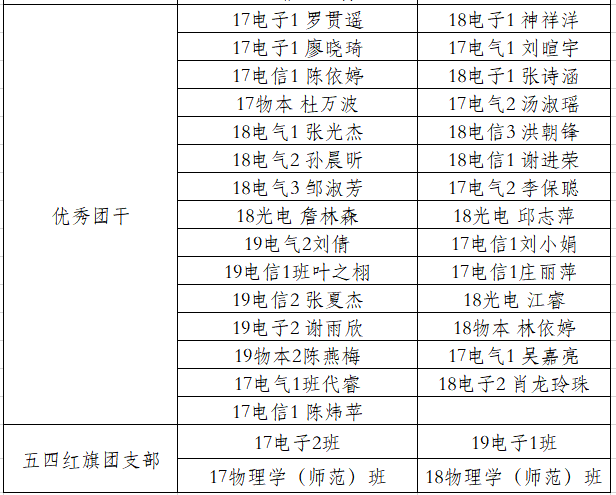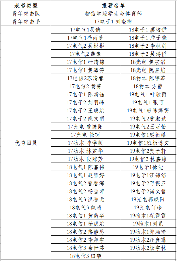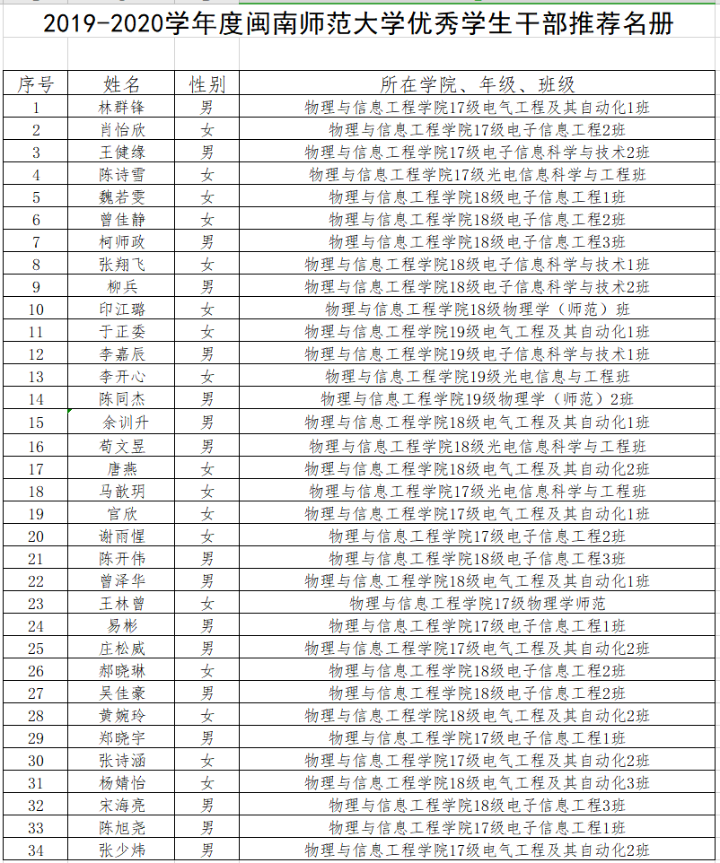 根据《关于开展yl23455永利集团2019年度“校青年五四奖章”和“校优秀共青团员”“校优秀共青团干部”“校青年突击队(手)”“校五四红旗团委(团支部)”评选表彰的通知(团闽南师委〔2020〕5号)》《关于评选表彰2019—2020学年度校“文明班集体”“优秀学生干部”的通知(学工〔2020〕9号)》文件精神,我院开展了五四评优评先评选推报工作,经个人申报、班级团支部、学生组织推荐,学院团委资格审查、学院学生工作领导小组评审等程序,确定推荐候选人(集体),现进行院内公示:
